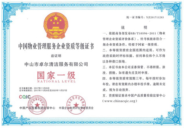 證書名稱:物業(yè)管理國家一級資質(zhì)
